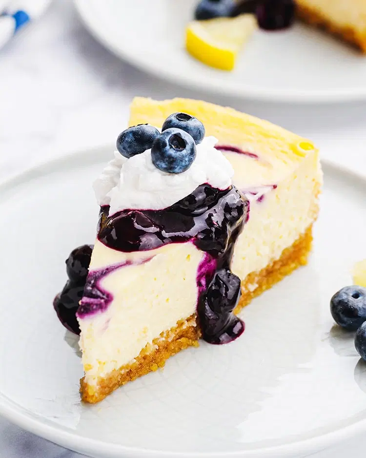 – Dollop by the spoonful over the top of the lemon cheesecake mixture. – Gently swirl through the dollops of blueberry with a butter knife to distribute. – Bake the cheesecake bars at 350° F for 25 - 30 minutes, or until set. – Remove from the oven and cool. – Chill for at least 2 hours, preferably longer before cutting into four by four rows of square bars and serve immediately. Store covered in the fridge for 4-5 days, or freeze for up to 2 months.