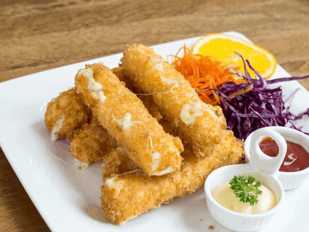 Dip the cheese in the egg, then roll in the coating and repeat for each stick so they are each coated twice and FULLY coated.